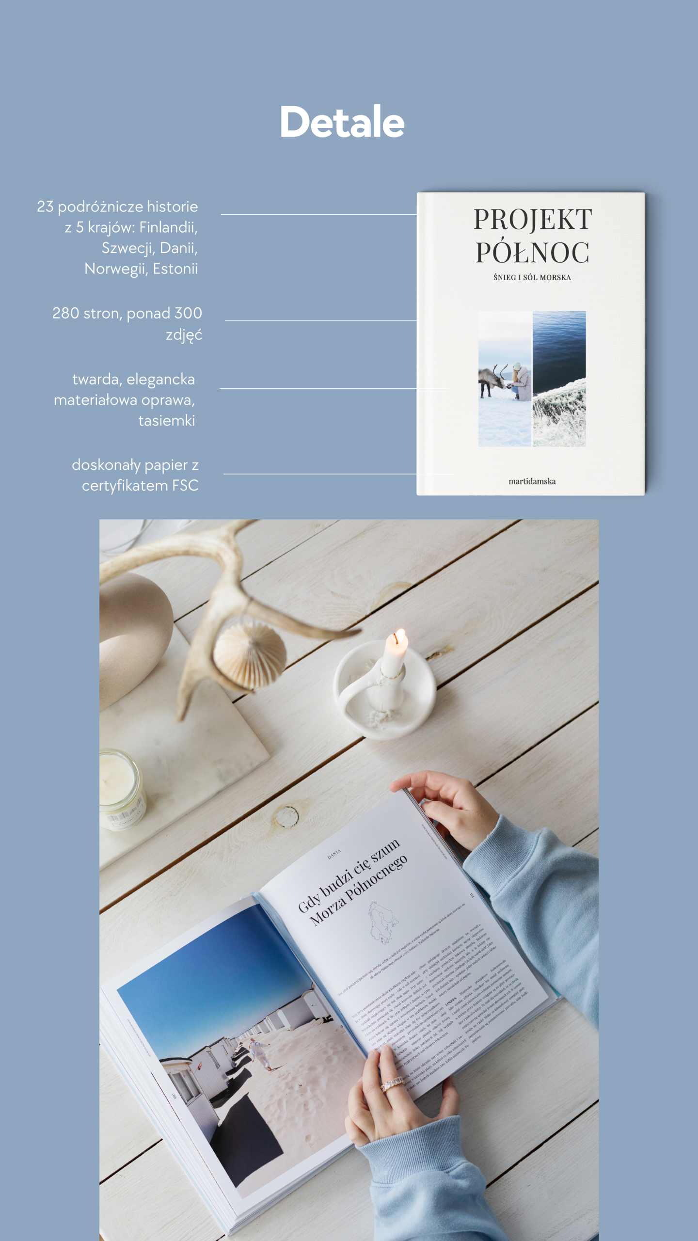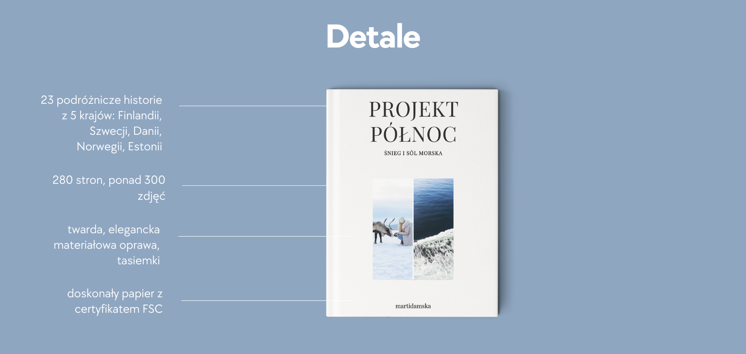 Naszym marzeniem jest, by każdy kto sięgnie po PROJEKT PÓŁNOC, choć na moment oderwał się od rzeczywistości i teleportował w jedno z pięknych miejsc, które opisujemy. By przeglądając strony albumu, móc poczuć wiatr we włosach, piasek jednej z plaż Morza Północnego, smak fińskich munkki i kawy z przelewu. By zamykając na moment oczy, wyobrazić sobie zjawiskową tęczę po największym sztormie, który przecież zawsze mija. By zaplanować podróż, inspirując się jednym z obrazków, które właśnie ma się przed oczami, przeglądając PROJEKT PÓŁNOC. By po prostu… Zamarzyć o Północy.